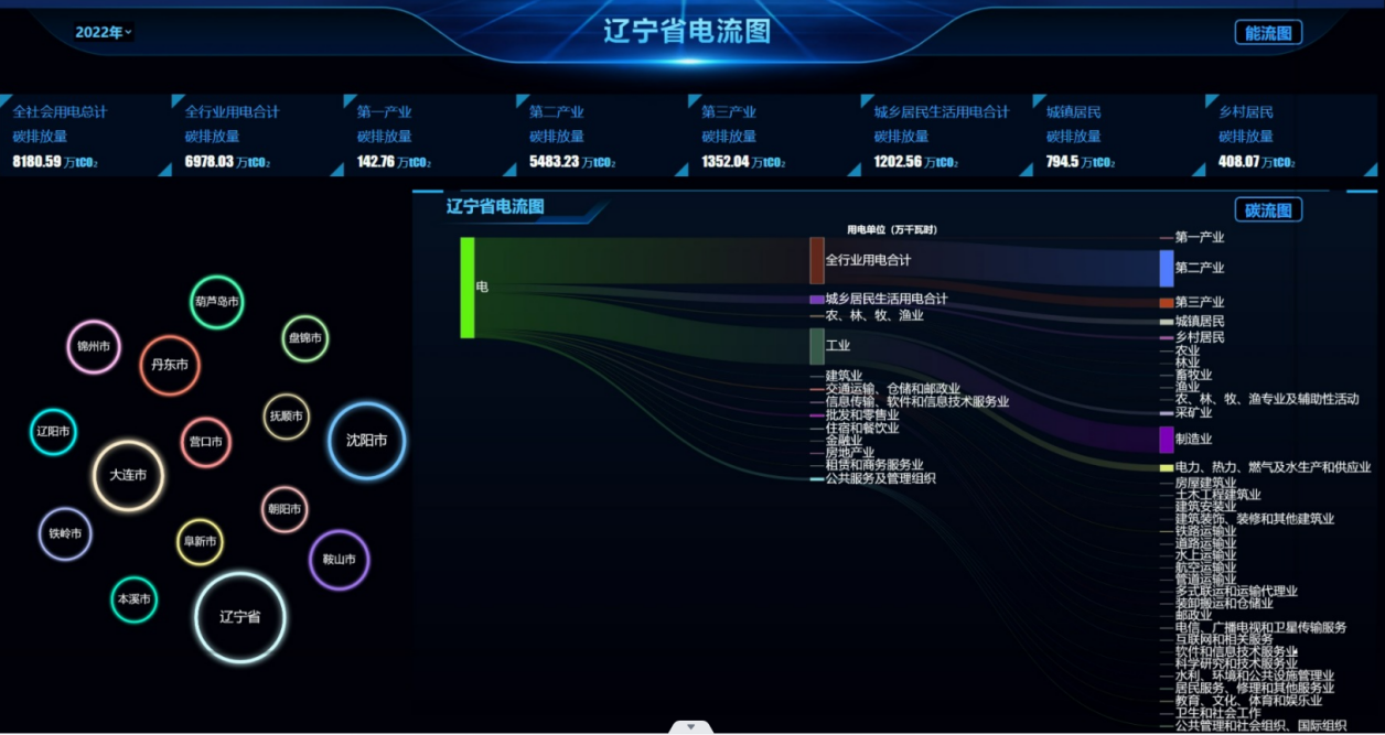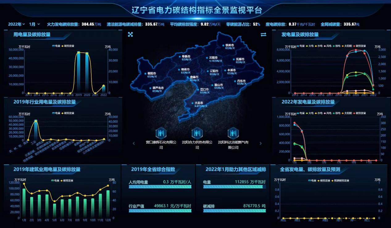 依托公司數據中臺、東北能源大數據中心和新能源云平臺數據資源和技術優(yōu)勢,建設基于能源數據的碳結構態(tài)勢感知平臺,實現碳排放相關數據匯聚、存儲計算、分析展現,在保障數據安全合規(guī)的前提下,為各級政府部門、企業(yè)提供碳排放監(jiān)測服務。目前,平臺提供的全省電碳熱力圖,基于全省14地市、11個行業(yè),以及第一產業(yè)、第二產業(yè)、第三產業(yè)等用電數據、對電碳排放量進行測算,從區(qū)域、產業(yè)布局等角度挖掘排放特性,構建全省電碳熱力圖、產業(yè)布局熱力圖。具體主要內容如下: