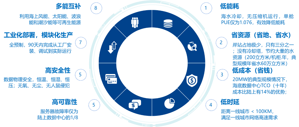 依靠海水自然冷源、無(wú)氧、無(wú)塵、模塊化部署等條件,海底數(shù)據(jù)中心在能耗、土地、水資源、故障率、交付周期等方面較陸地?cái)?shù)據(jù)中心有著獨(dú)特的優(yōu)勢(shì)。根據(jù)清華大學(xué)傳熱與能源利用北京重點(diǎn)實(shí)驗(yàn)室出具的能效測(cè)試報(bào)告,海底數(shù)據(jù)中心的單艙P(yáng)UE值為1.076。這一指標(biāo)保證了海底數(shù)據(jù)中心節(jié)能降耗,在其生命周期內(nèi)具備比陸地?cái)?shù)據(jù)中心更好的經(jīng)濟(jì)優(yōu)勢(shì)。由于海底數(shù)據(jù)中心散熱不需要消耗水,運(yùn)營(yíng)過(guò)程中每年每個(gè)機(jī)柜可以節(jié)約200立方米的水資源。海底數(shù)據(jù)中心通過(guò)工程預(yù)制實(shí)現(xiàn)了快速部署,建設(shè)由“工地”遷移到“工廠”,具備了工業(yè)化的本質(zhì),可實(shí)現(xiàn)一體化交付,規(guī)模化運(yùn)維。我國(guó)東部地區(qū)具有臨海的區(qū)位優(yōu)勢(shì),集聚了全國(guó)超過(guò)45%的人口和近60%的GDP。對(duì)于上海、深圳這一類(lèi)沿海超大城市,海底數(shù)據(jù)中心的價(jià)值特點(diǎn)尤為突出。