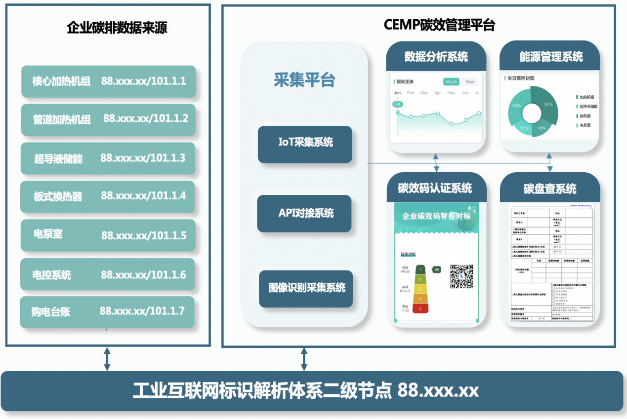 通過CEMP碳效管理平臺與電能供熱系統(tǒng)各環(huán)節(jié)數(shù)據(jù)采集設(shè)備對接,完成適配及平臺調(diào)試,實(shí)現(xiàn)標(biāo)識解析二級節(jié)點(diǎn)部署及相關(guān)管理權(quán)限設(shè)定。