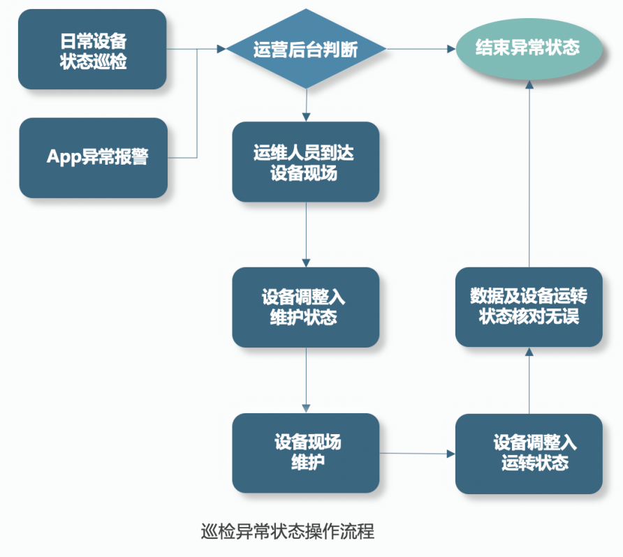 為了及時(shí)解決各類突發(fā)問題造成的設(shè)備告警,保證監(jiān)測設(shè)備穩(wěn)定運(yùn)行,根據(jù)后臺信息實(shí)時(shí)查看設(shè)備狀況,實(shí)施單位進(jìn)行定期或臨時(shí)的設(shè)備運(yùn)維。依照設(shè)備檢定流程,實(shí)施單位定期對設(shè)備狀態(tài)進(jìn)行巡檢,發(fā)現(xiàn)設(shè)備狀態(tài)異常后,按照如下流程處理: