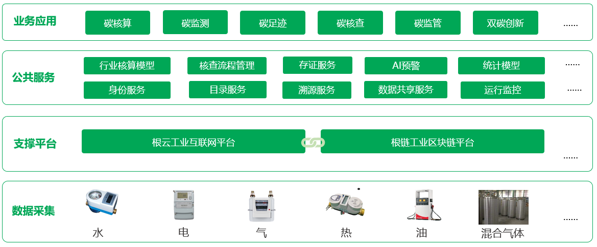 基于工業區塊鏈的智慧碳排放管理平臺(iCEP)由數據采集層、平臺層、公共服務層和業務應用層構成。基于物聯網的數據采集層適配企業各種生產環境中相關儀器、儀表、設備等,對企業導致的溫室氣體排放相關數據進行自動采集。平臺層集合了根云工業互聯網平臺和根鏈工業區塊鏈平臺,為企業能源數據提供采集、存儲、清洗、匯總等功能,并支持數據上鏈存證。公共服務層提供不同應用所需公共服務模塊,支持上層應用所需要的用戶管理、安全管理、加解密服務、數據處理服務、運維服務等功能。上層應用主要面向不同場景提供支持雙碳工作所需要的應用,如碳足跡、碳核查、碳監管以及雙碳創新業務。