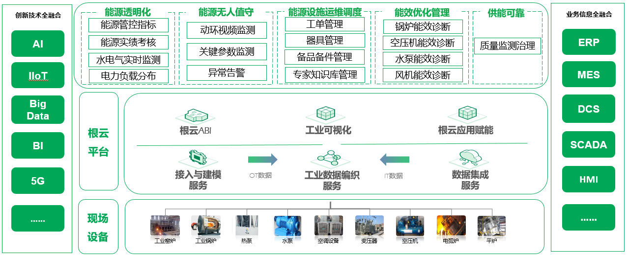 通過工業互聯網平臺,將工業現場各種儀器、儀表數據采集連接起來,并與企業生產系統打通。形成完整的能源管理解決方案,支持能源管理透明化、無人值守運維、能源優化管理和能源設置運維調度等功能模塊。