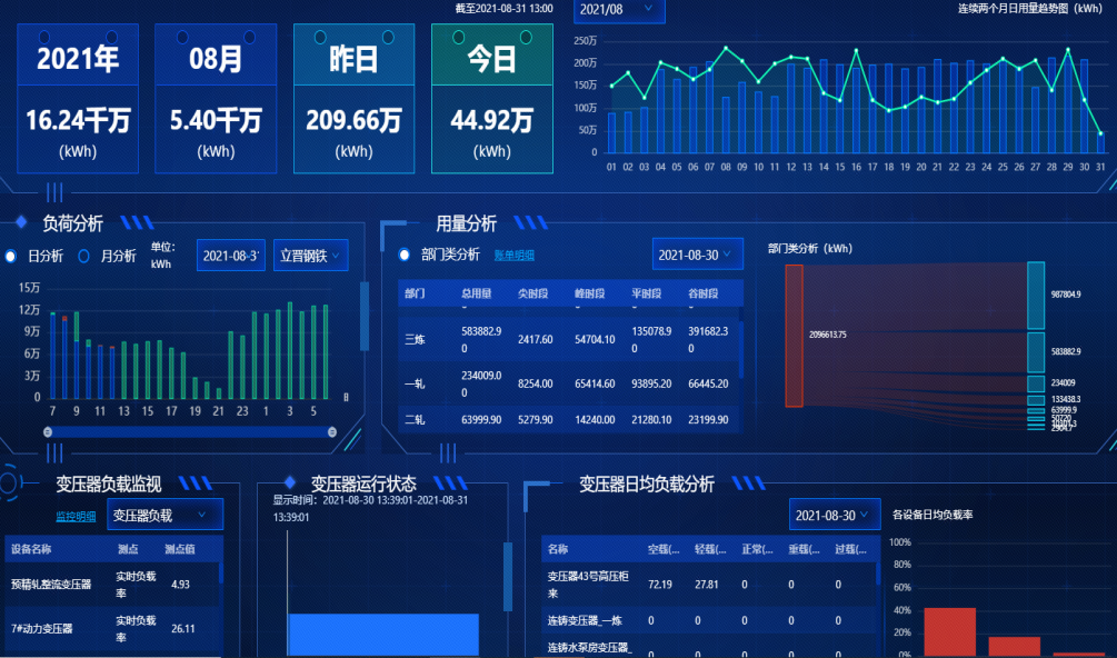 方便能源管理。直觀查看當年、當月、當日及昨日的用電量,負荷變化,日用量趨勢圖變化;變壓器負載監測,全面掌握變壓器運行狀態。節約成本,根據尖峰平谷占比分析,幫助企業合理規劃用電負荷。安全用電,變壓器實時監控,異常提前感知,保障企業安全用電。優化用能,實時反饋用能數據,一旦超標,觸發報警,幫助企業實時追蹤問題,及時解決,最大化減少損失;尖峰平谷關鍵耗能設備關閉與啟動報警提醒,節省成本。