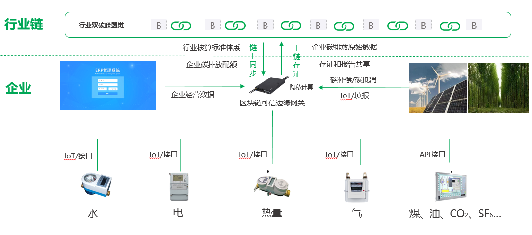 企業碳監測網絡采用企業邊緣側、行業鏈雙層架構模式。在企業網絡內部署區塊鏈可信邊緣網關,與企業的IoT采集系統、能源管理系統、ERP等相關系統打通,以聯盟鏈節點方式無縫接入行業區塊鏈網絡。可信邊緣網關可以從鏈上自動接收行業核算標準體系(智能合約),以統一的標準、方法對企業的碳排放進行核算;可信邊緣網關采用支持可信執行環境(TEE)技術的硬件,保證數據核算的應用與鏈上合約要求的一致性。根據核算標準體系動態抽取企業碳排放活動水平數據和企業的經營數據,如水、電、油、氣、煤等能耗數據;CO2、SF6等過程逸散數據;能源結算報表、財務三表數據;同時,為實現企業碳排放的精準核算,還需將諸如企業的綠電使用、儲能回收等碳補償/碳抵消數據進行接入;然后,可信邊緣網關后臺基于隱私計算模型自動測算企業碳排放量,也可按設定頻次定期生成企業碳排放核算報告;最后,碳排放核算結果及核算報告第一時間上鏈存證并分享給相關方。