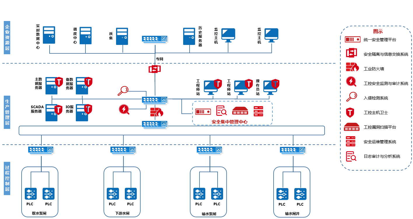 面對越來越嚴峻的信息安全形勢,我國高度重視工業控制系統信息安全工作。 2016年10月17日,工信部信軟〔2016〕338號《工業控制系統信息安全防護指南》正式頒布,指出工業控制系統應用企業應從安全軟件選擇與管理、配置和補丁管理、邊界安全防護、物理和環境安全防護、身份認證、遠程訪問安全、安全監測和應急預案演練、資產安全、數據安全、供應鏈管理、落實責任十一個方面做好工控安全防護工作,切實提升工業控制系統信息安全防護水平,保障工業控制系統安全。2017年6月1日起《中華人民共和國網絡安全法》正式施行,其中明確提出“基礎設施的運行安全”,要在等級保護的基礎上實行重點防護。2021年9月1日起《關鍵信息基礎設施安全保護條例》正式實施,明確規定了關鍵信息基礎設施包括水利等重要行業和領域的重要網絡設施、信息系統等。