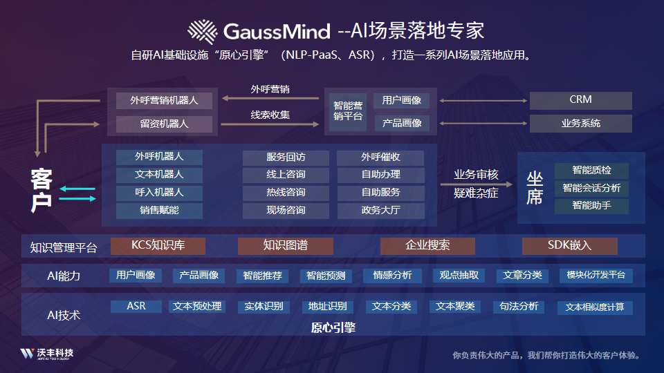 GaussMind是AI場景落地專家,主攻語音語義融合技術,自研領先的AI基礎設施“原心引擎”(NLP-PaaS、ASR),打造了“AI產品應用”文本機器人、留資機器人、語音機器人(外呼機器人、呼入機器人)、虛擬數字人、智能質檢、智能會話分析、企業微信會話分析、智能坐席助手、智能拓客,“AI知識中臺”企業搜索、KCS知識庫、知識圖譜,以及“AI模塊化開發平臺”用戶/產品畫像、智能推薦、智能營銷,通過“產品應用+知識中臺+模塊化開發平臺”的閉環AI技術,全面助力企業打造營銷、管理、服務等場景的AI原生體驗。