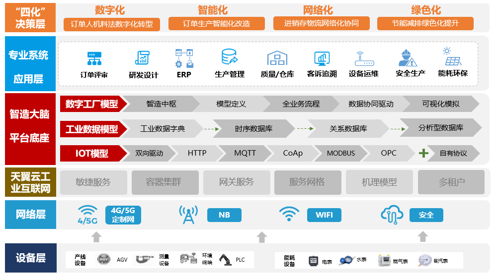 本項目設計框架是將基于天翼云雙跨工業互聯網平臺為基礎能力,以引入PaaS應用治理、數據治理技術輕量架構,打造企業天翼智造大腦,構建新一代信息技術的企業數字化系統架構,以更平滑方式兼容企業現有系統架構系統,并助力企業系統實現無縫升級迭代。如圖1所示