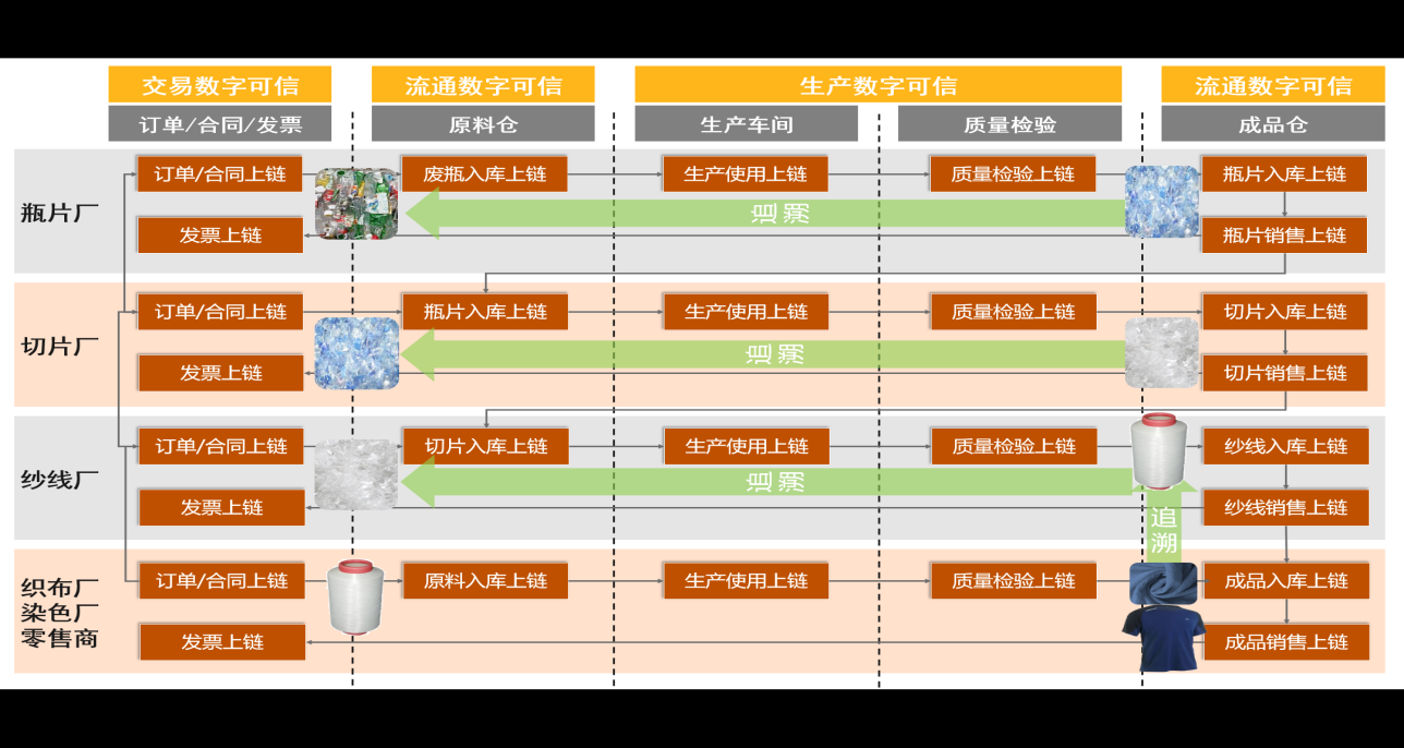 產品上下游對接,實現對再生纖維產品全生命周期信息的跟蹤和溯源。瓶片以及切片生產結束后,運輸至紗線生產環節作為原料入庫掃碼解析標識信息,通過可信平臺的原料核銷實現供應商的出庫數據與入庫數據一一對應,不同于以往僅是測算入庫原料和出庫產品實現內部生產的總量平衡。再生纖維產品經廢品回收、瓶片制作至切片、紗線制作、織布成品、印染等工序協同,在不同生產環節之間,利用可信平臺這一“橋梁”形成信息回溯鏈,可在生產、流通和使用等環節對產品進行追蹤,利用標識和區塊鏈技術實現了跨企業物料加工與生產流程的穿透追溯。