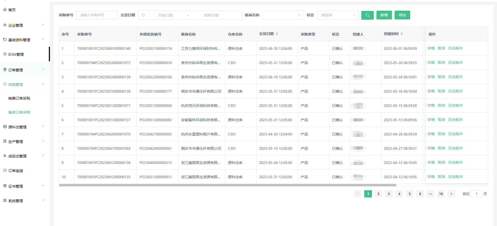 訂單信息 | 采購單號、采購單關聯的原材料物料、數量、交貨時間、質量要求、發貨要求 |