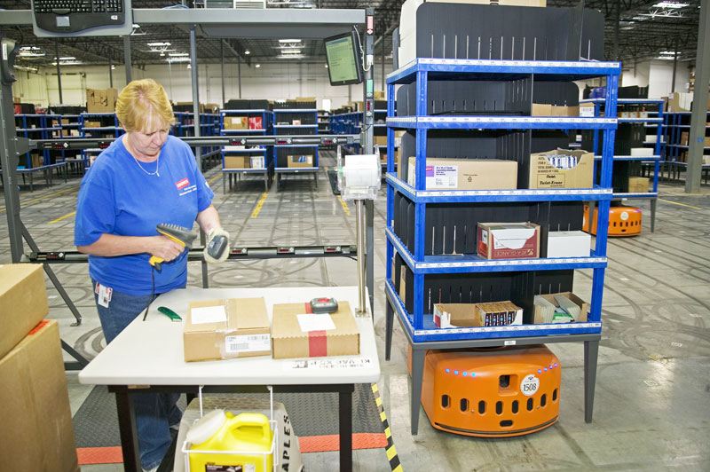傳統(tǒng)有人倉庫,貨物采用人工揀選方式。即人員根據(jù)訂單信息,在貨架區(qū)域中尋找貨物。然后將找到所有貨物掃碼、裝框后交給打包環(huán)節(jié)。需要人力投入大、勞動(dòng)強(qiáng)度較高、揀選效率難以滿足忙時(shí)要求。