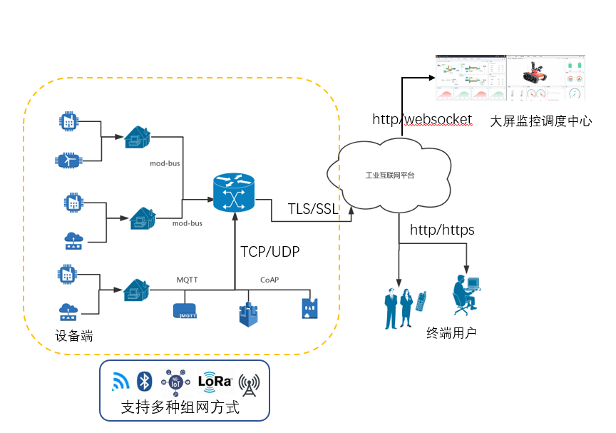 本解決方案支持ModBus,MQTT,CoAP,TCP/UDP,TLS/SSL等數(shù)據(jù)采集和傳輸協(xié)議,在云端與用戶端,支持HTTP,HTTPS,WebSocket等主流標(biāo)準(zhǔn)協(xié)議。在網(wǎng)絡(luò)適配方面,支持WiFi,NB-IoT,LoRa,GPRS/3G/4G等。