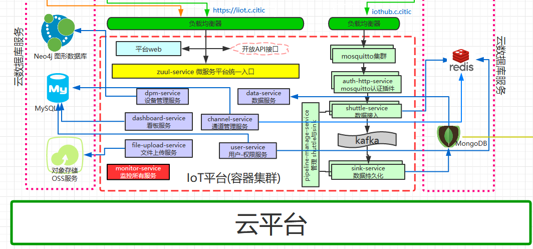 本方案涉及的平臺是基于業(yè)界開放標(biāo)準(zhǔn)完全自主開發(fā)的,擁有100%的自主知識產(chǎn)權(quán)。系統(tǒng)以微服務(wù)為開發(fā)架構(gòu),以工業(yè)互聯(lián)網(wǎng)平臺為核心,以自服務(wù)和SaaS化為根本宗旨。根據(jù)數(shù)據(jù)的不同用途,分別保存到MySQL, Redis, MongoDB, Neo4j圖數(shù)據(jù)庫。平臺提供開放API接口,符合云計算架構(gòu)規(guī)范,可以基于公有云、私有云、混合云提供服務(wù)。